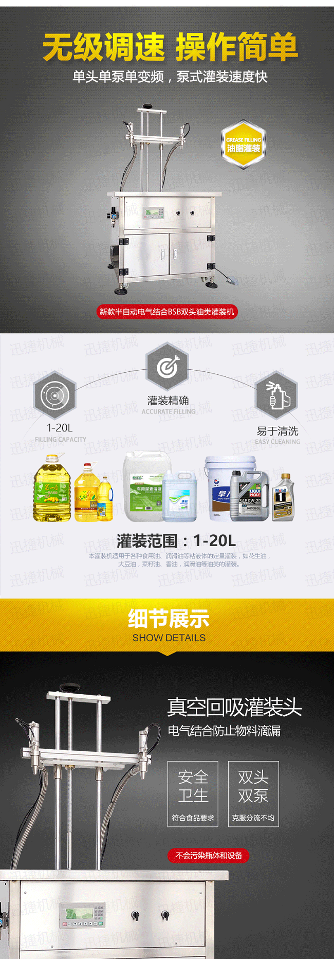 半自動食用油灌裝機適用于各種食用油、潤滑油等粘液體的定量灌裝,如花生油,大豆油,菜籽油、香油,潤滑油等油類的灌裝。采用先進的定量灌裝技術,結合微電子智能控制技術單頭單變頻控制系統,實現高精度、無級調速,操作簡單。各個灌裝頭可在一定范圍內任意調節間距和灌裝量,可使用各種大小形狀的容器的灌裝。自動化程度高。另外,機身零件采用優質不銹鋼制造,即耐用又衛生,長時間工作性能可靠穩定。達到GMP衛生要求。本公司產品通過了IS9000質量體系認證。本設備經久耐用,性能穩定,是食用油、潤滑油等行業理想的灌裝設備。